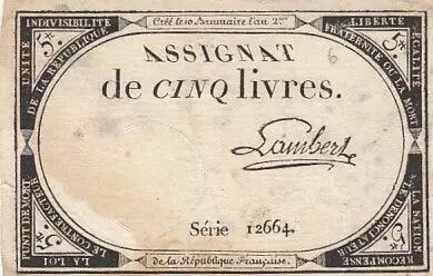 Accueil > Billets Français > Assignats > France 5 Livres - 10 Brumaire An II (31.10.1793) - Sign. Lambert - Série 12664