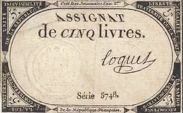 Billet France 5 Livres - 10 Brumaire An II (31.10.1793) - Sign. Loquet - Série 5748