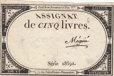 Accueil > Billets Français > Assignats > France 5 Livres - 10 Brumaire An II (31.10.1793) - Sign. Mégnie - Série 18592