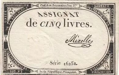 Billet France 5 Livres - 10 Brumaire An II (31.10.1793) - Sign. Michaux - Série 19984