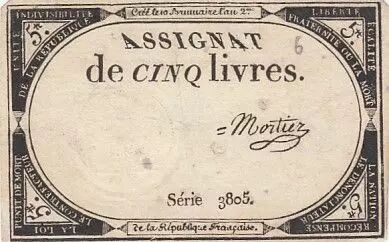 Billet France 5 Livres - 10 Brumaire An II (31.10.1793) - Sign. Mortiez - Série 3805