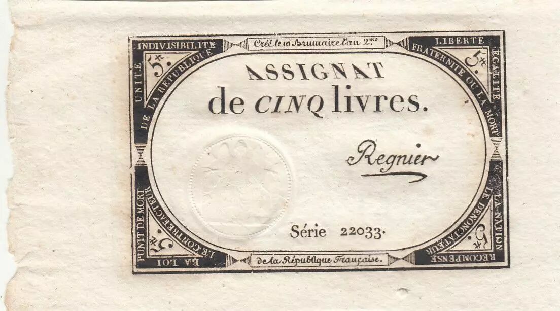 Billet France 5 Livres - 10 Brumaire An II (31.10.1793) - Sign. Regnier - Série 22033