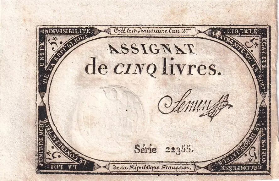 Il s'agit d'un assignat de cinq livres émis en France le 10 Brumaire de l'an II (31 octobre 1793) de la République Française. Cet assignat porte la signature de Semen et appartient à la série 22355.
