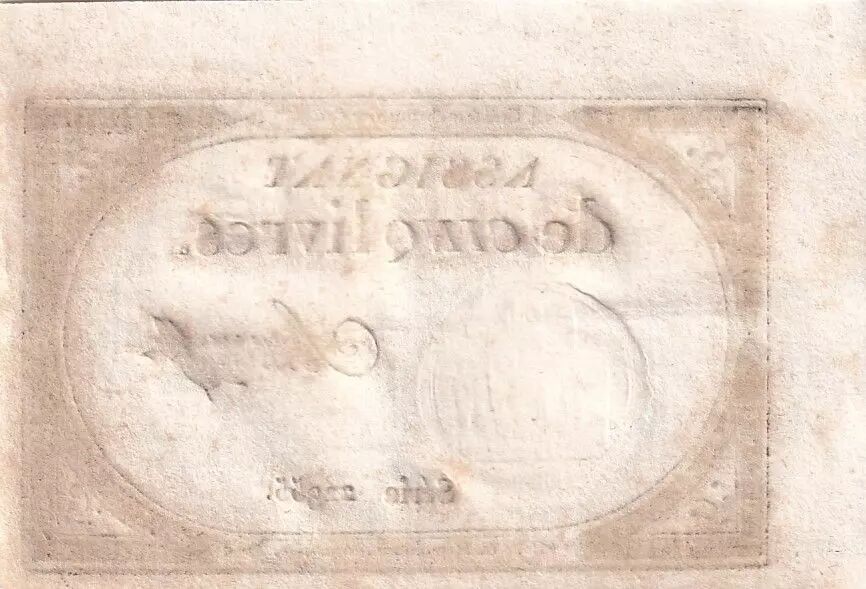 Le verso de l'assignat est vierge. Un filigrane est intégré au papier. Il représente la valeur "5" ainsi qu'un monogramme "RF" (République Française) inscrit dans un cercle.