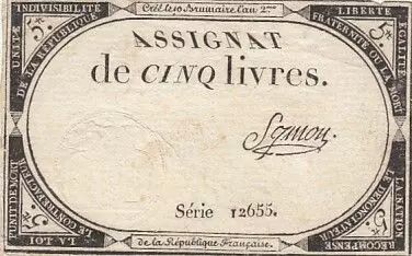 Accueil > Archivage > archivage-Billets Français > France 5 Livres - 10 Brumaire An II (31.10.1793) - Sign. Symon - Série 12655