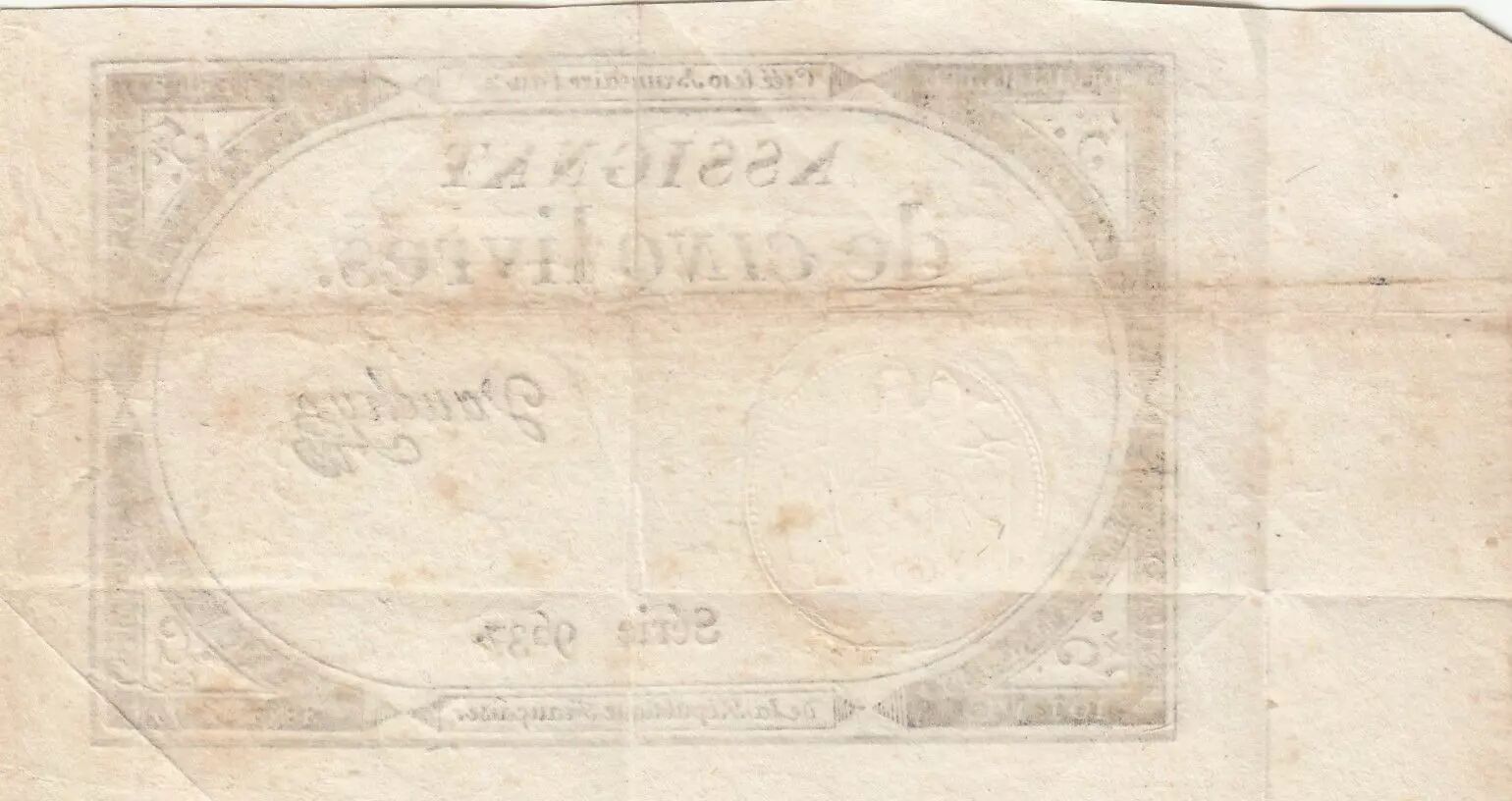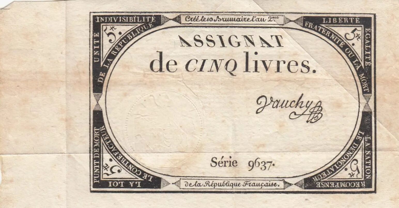 Accueil > Archivage > archivage-Billets Français > France 5 Livres - 10 Brumaire An II (31.10.1793) - Sign. Yauchy - Série 9637