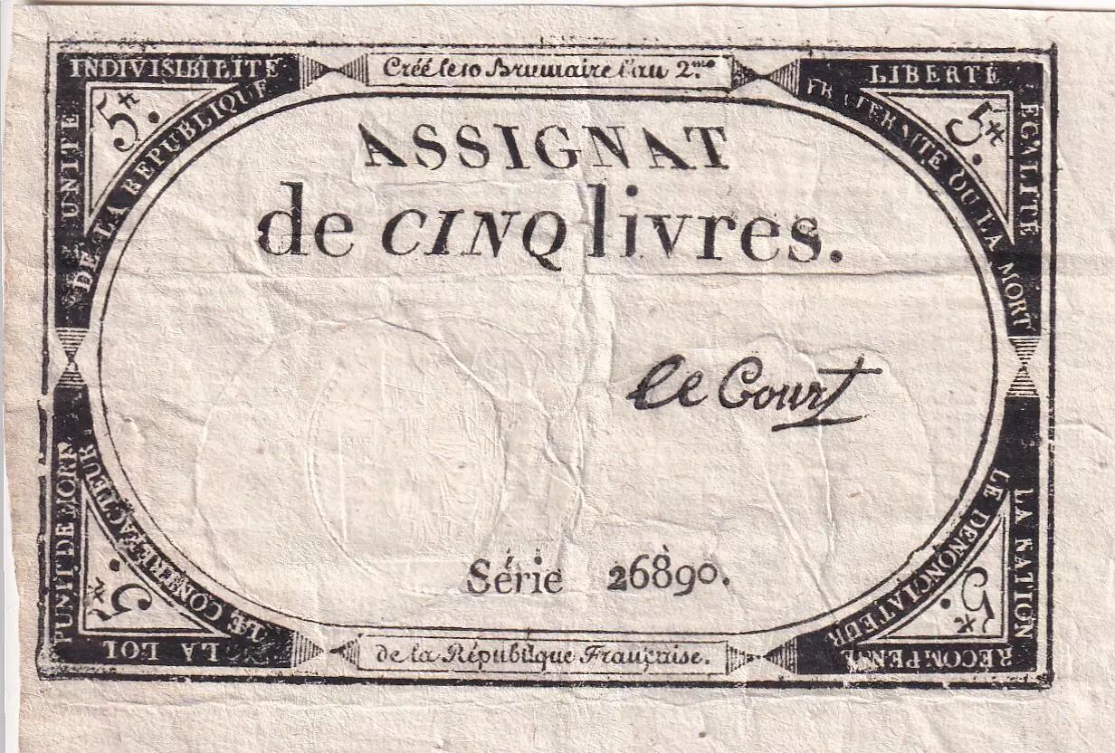 Banknote France 5 Livres - 10 Brumaire Year II (31-10-1793) - Sign Lecourt - Serial 26890 - P. A.76