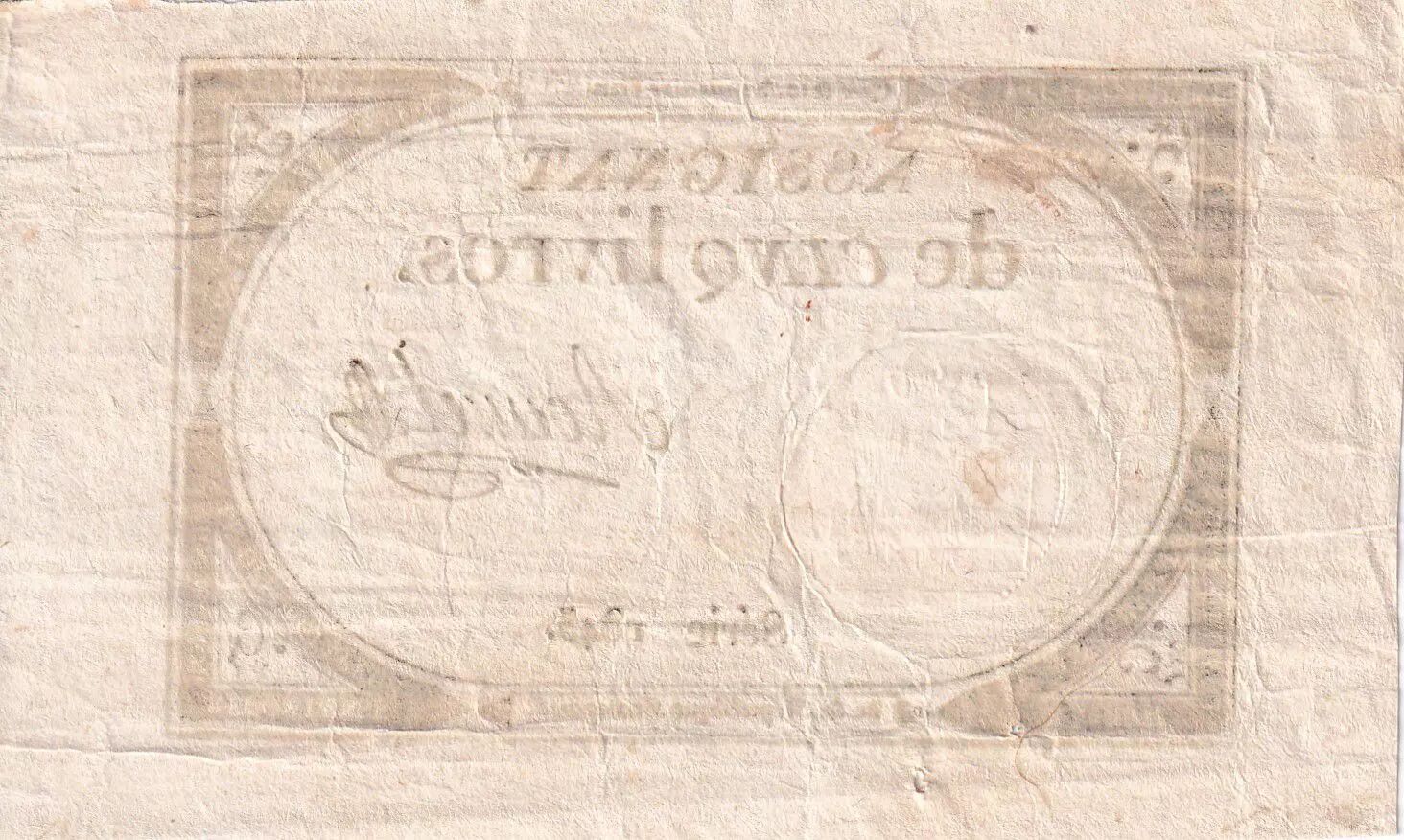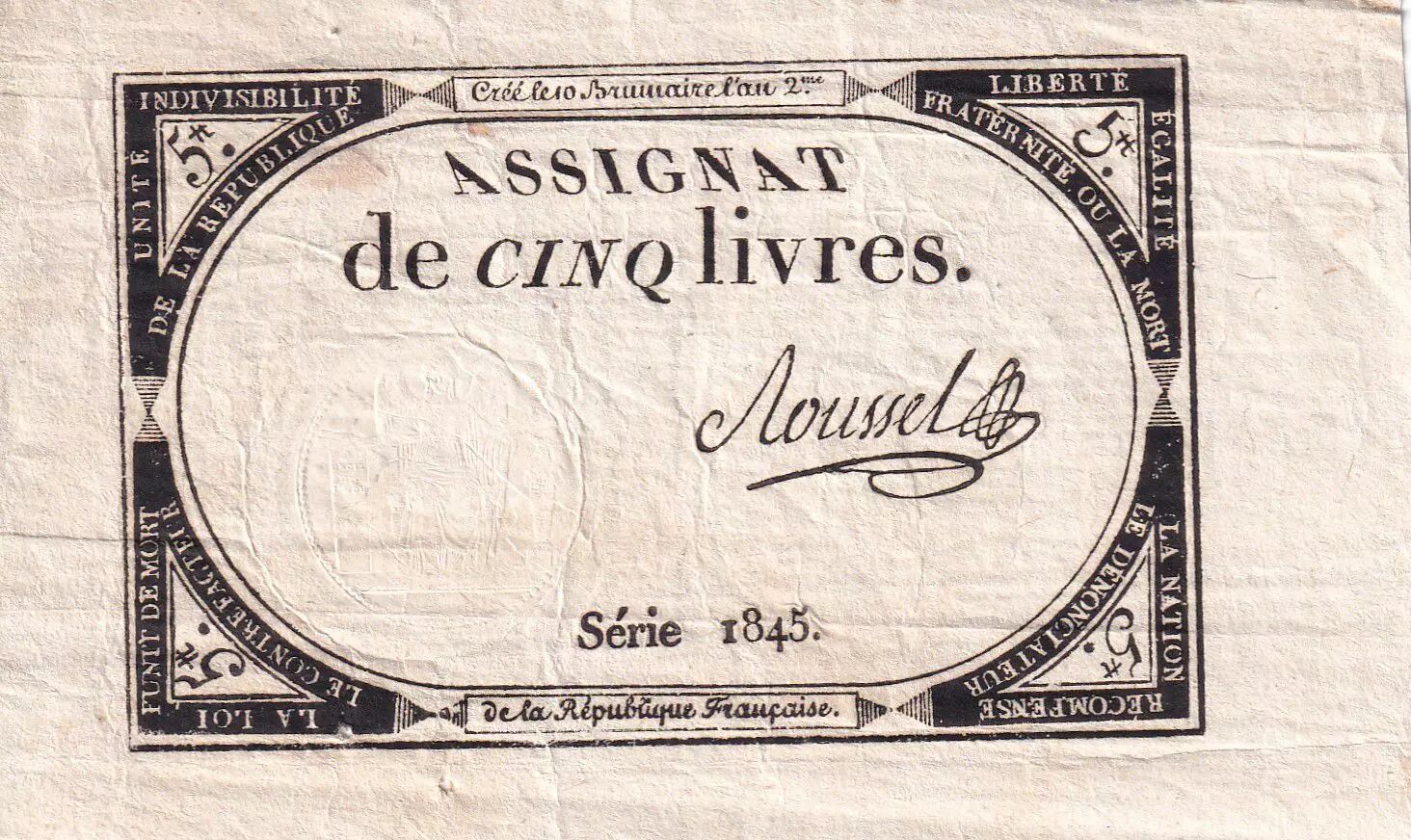 Banknote France 5 Livres - 10 Brumaire Year II (31-10-1793) - Sign Roussel - Serial 1845 - P. A.76