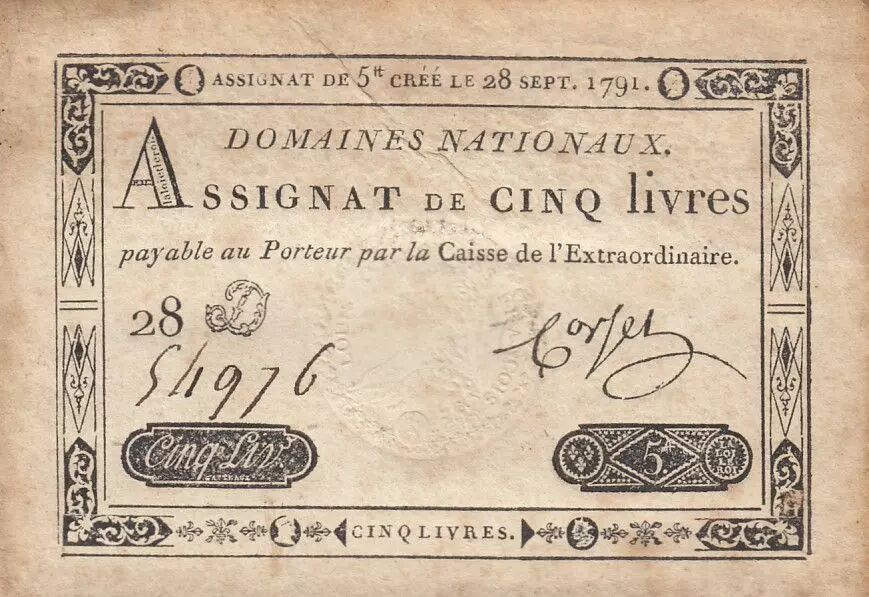 Billet France 5 Livres - 28 Septembre 1791 - Sign. Corsel - Série 28D