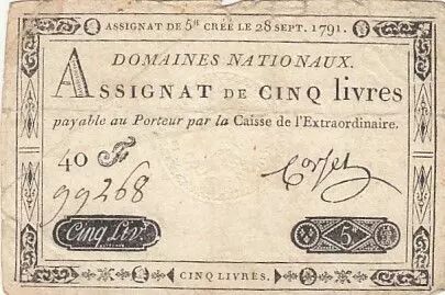 Billet France 5 Livres - 28 Septembre 1791 - Sign. Corsel - Série 40F