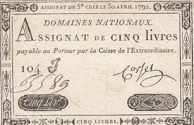 Accueil > Archivage > archivage-Billets Français > France 5 Livres - 30 Avril 1792 - Sign. Corsel - Série 104J