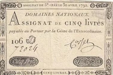 Billet France 5 Livres - 30 Avril 1792 - Sign. Corsel - Série 106D