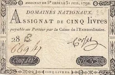 Accueil > Archivage > archivage-Archivage > France 5 Livres - 31 Juillet 1792 - Sign. Corsel - Série 28E