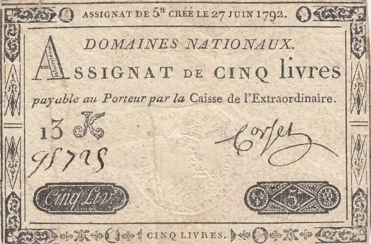Banknote France 5 Livres Embossed seal Louis XVI - 27-06-1792 - Serial 13K