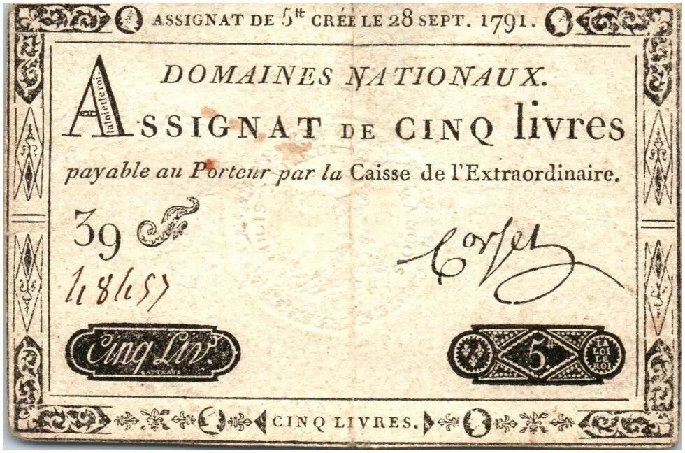 Banknote France 5 Livres Embossed seal with Louis XVI (1791-09-28)