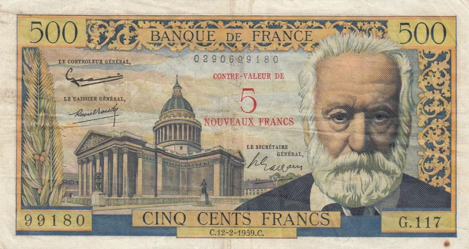 On the front of the banknote, there is a portrait of Victor Hugo placed on the right. In the background, a representation of the Pantheon is visible. The face value of "5 NF" is printed twice, and the mention "BANQUE DE FRANCE" also appears. The sum of "CINQ NOUVEAUX FRANCS" is written out in full. The name of the engraver, André Marliat, and that of the designer, Clément Serveau, are also indicated.
