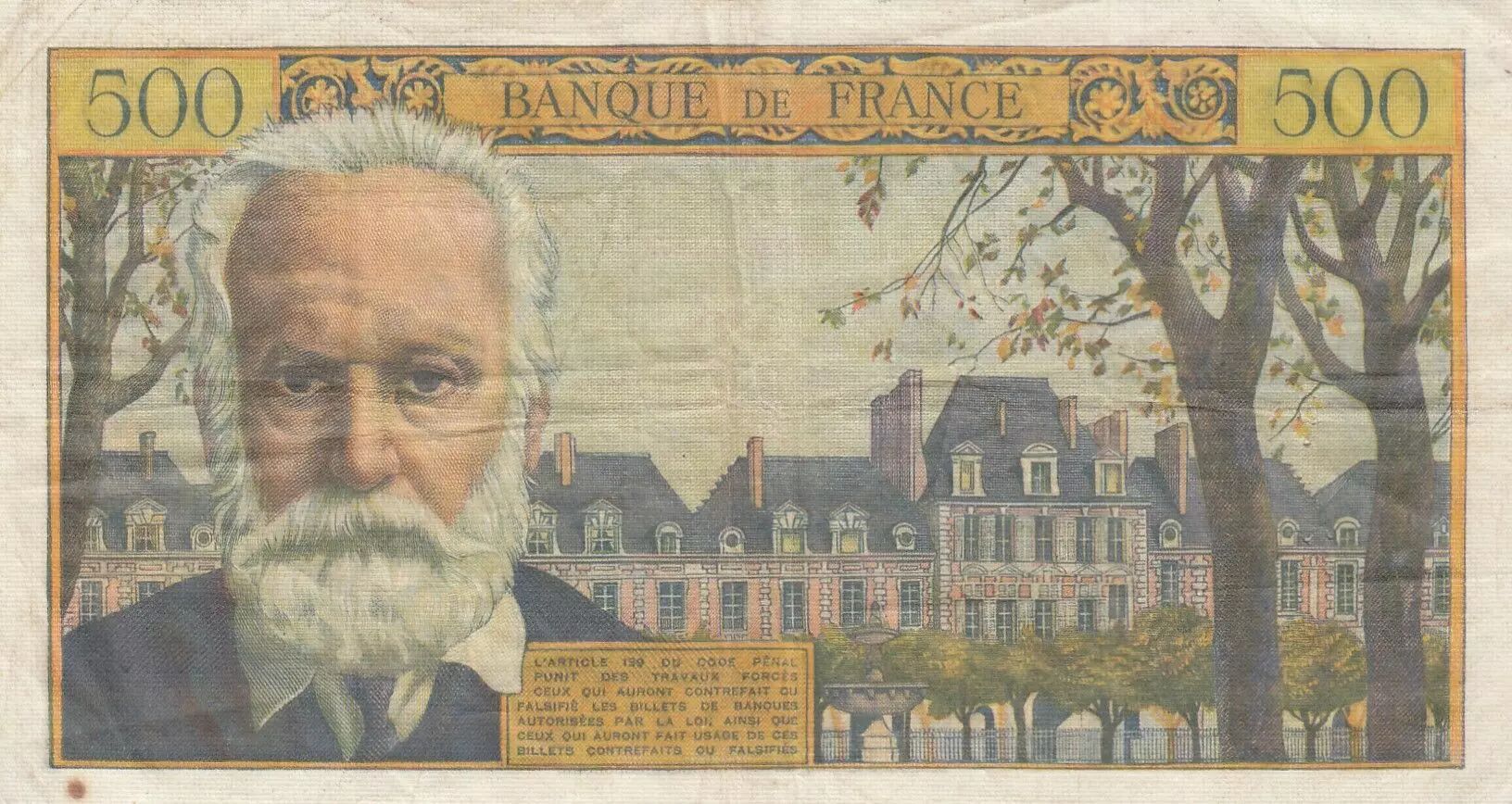 The back of the banknote features an image of Victor Hugo located on the left. In the background, we see a view of his apartment, Place des Vosges. The face value "5" is repeated twice, accompanied by the mention "BANQUE DE FRANCE". An excerpt from Article 139 of the Penal Code is included, recalling the penalties for counterfeiting or falsifying banknotes. The name of the engraver, Robert Armanelli, and that of the designer, Clément Serveau, are also mentioned.