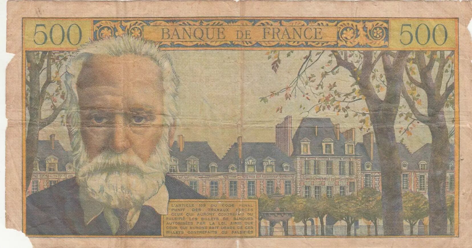 Le verso du billet présente une image de Victor Hugo situé sur la gauche. En arrière-plan, on aperçoit une vue de son appartement, place des Vosges. La valeur nominale "5" est répétée à deux reprises, accompagnée de la mention "BANQUE DE FRANCE". Un extrait de l'article 139 du Code pénal est inclus, rappelant les sanctions pour la contrefaçon ou la falsification de billets de banque. Le nom du graveur, Robert Armanelli, et celui du dessinateur, Clément Serveau, sont également mentionnés.