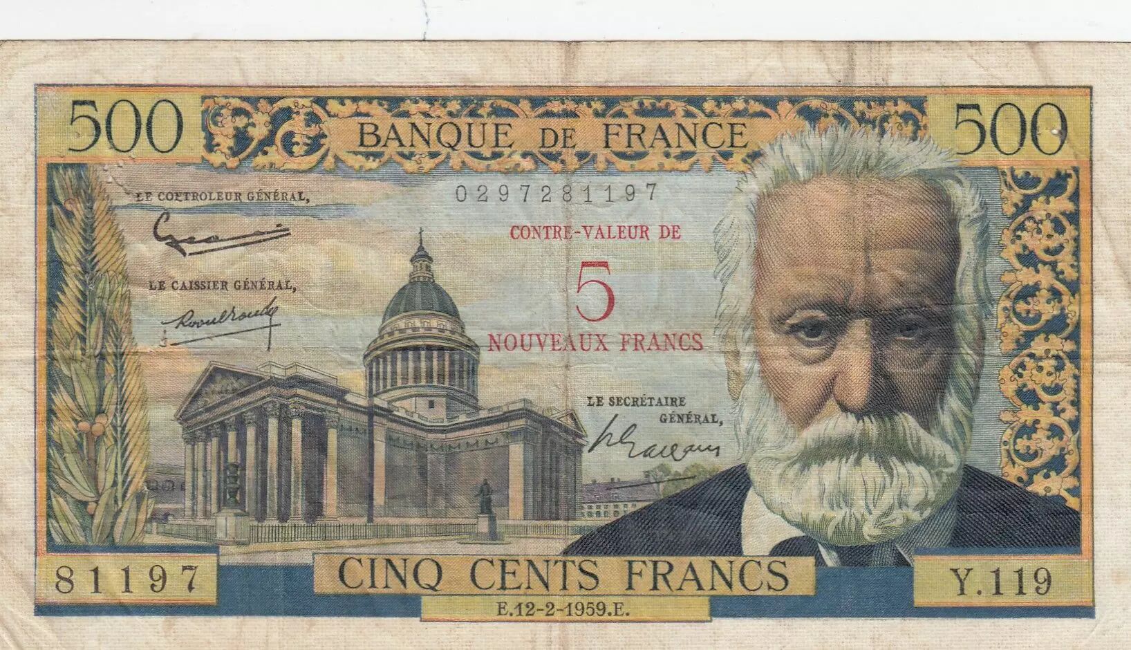 Accueil > Archivage > France 5 NF sur 500 Francs - Victor Hugo - 12-02-1959 - Série H.121 - F.52.02