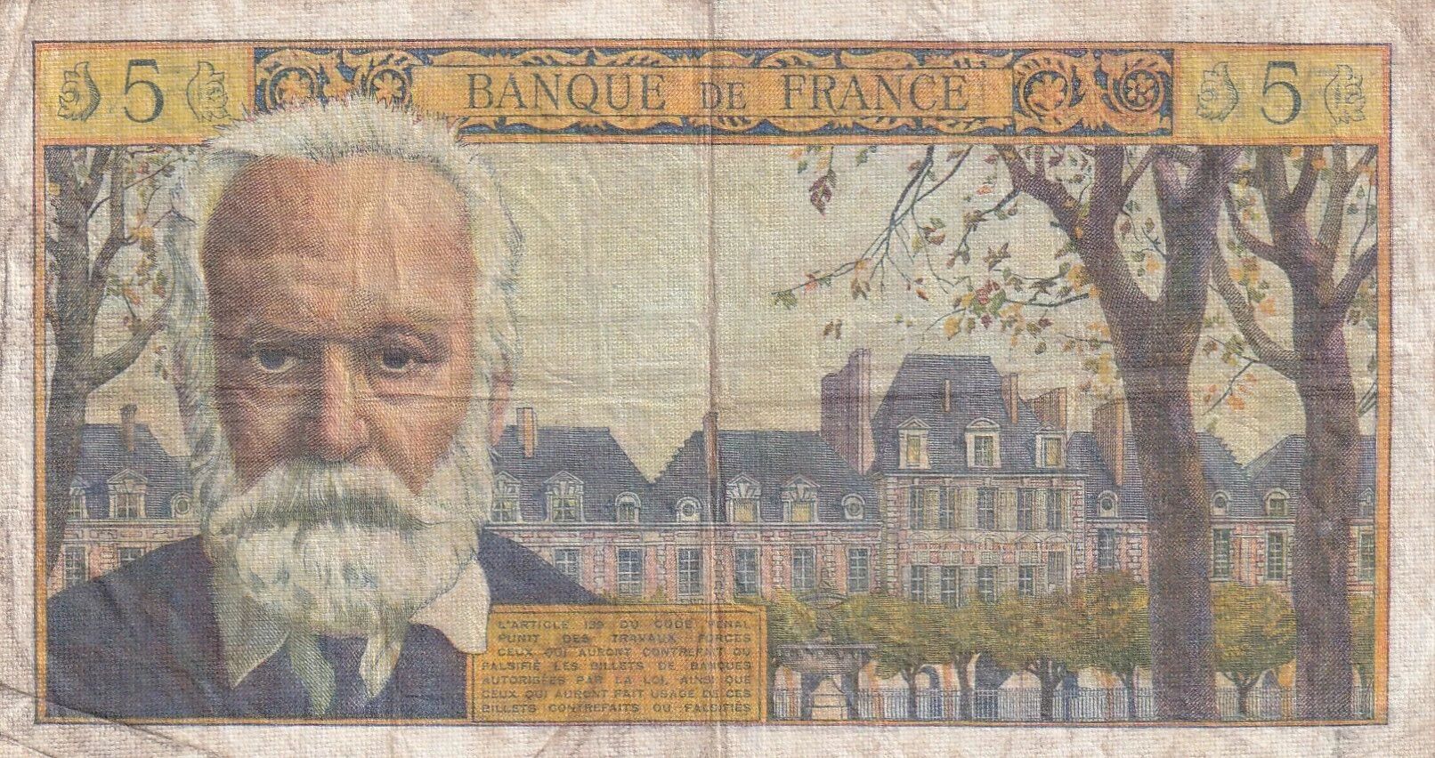 The front of the banknote features a portrait of Victor Hugo on the right. In the background, a representation of the Panthéon is visible. The inscription "5 NF BANQUE DE FRANCE 5 NF" also appears on this side, along with the words "CINQ NOUVEAUX FRANCS". The script used is Latin.