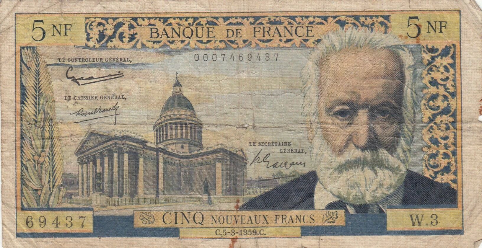 Ce billet de banque français d'une valeur nominale de 5 francs a été émis le 5 mars 1959. Il appartient à la série W.3 et pèse environ 1 gramme. Ses dimensions sont de 140 millimètres de longueur et 75 millimètres de largeur.