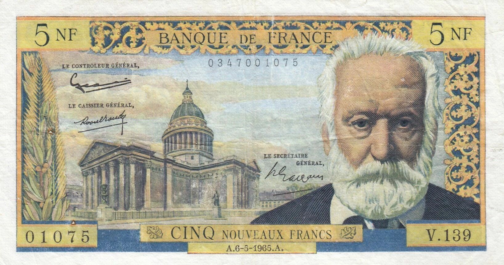 Le produit est un billet de banque de France, d'une valeur nominale de cinq francs, émis en 1965. Il s'agit d'un billet de la série V.139, commémorant Victor Hugo.