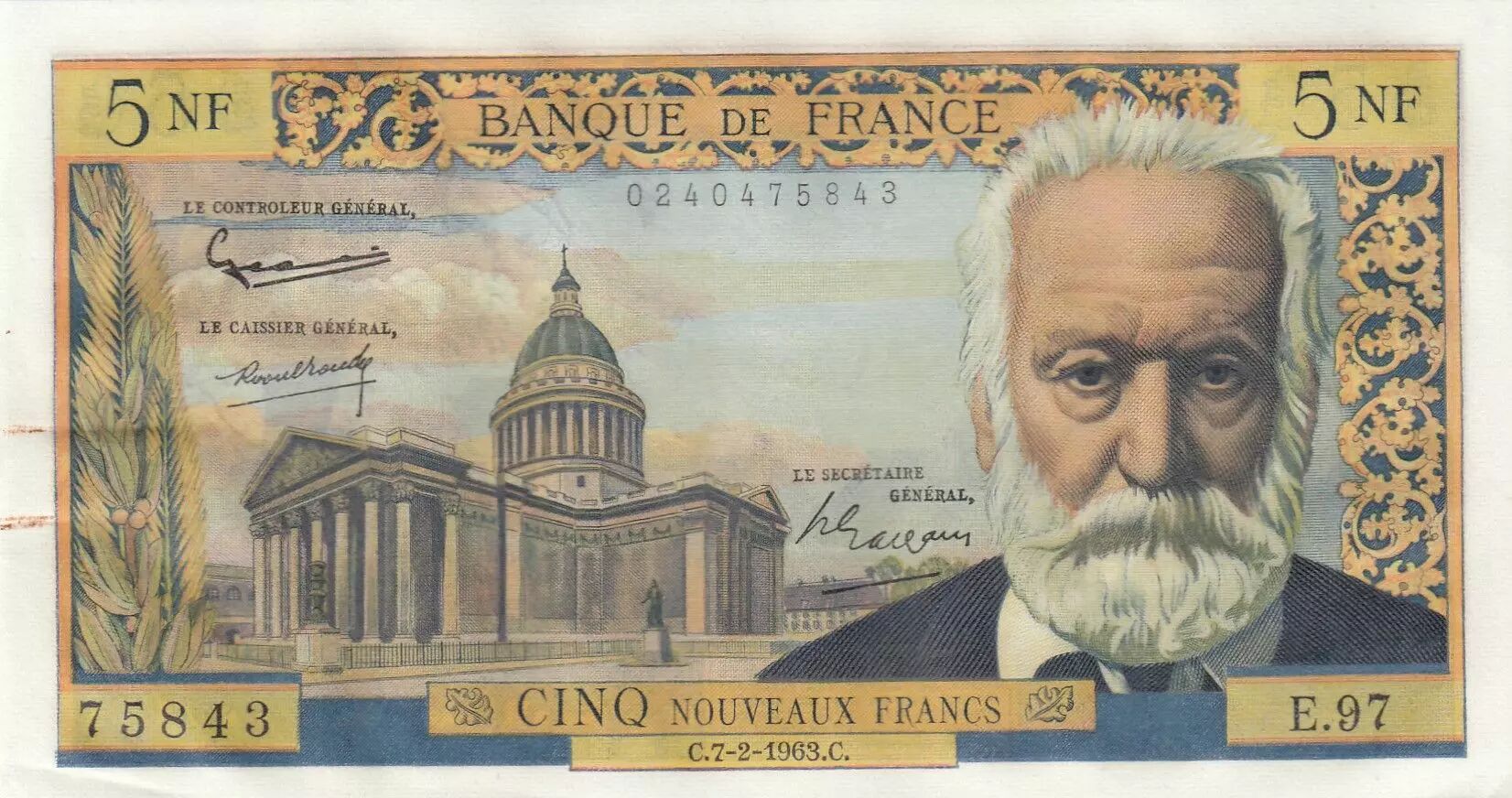 Billet France 5 NF - Victor Hugo - 07-02-1963 - Série E.97