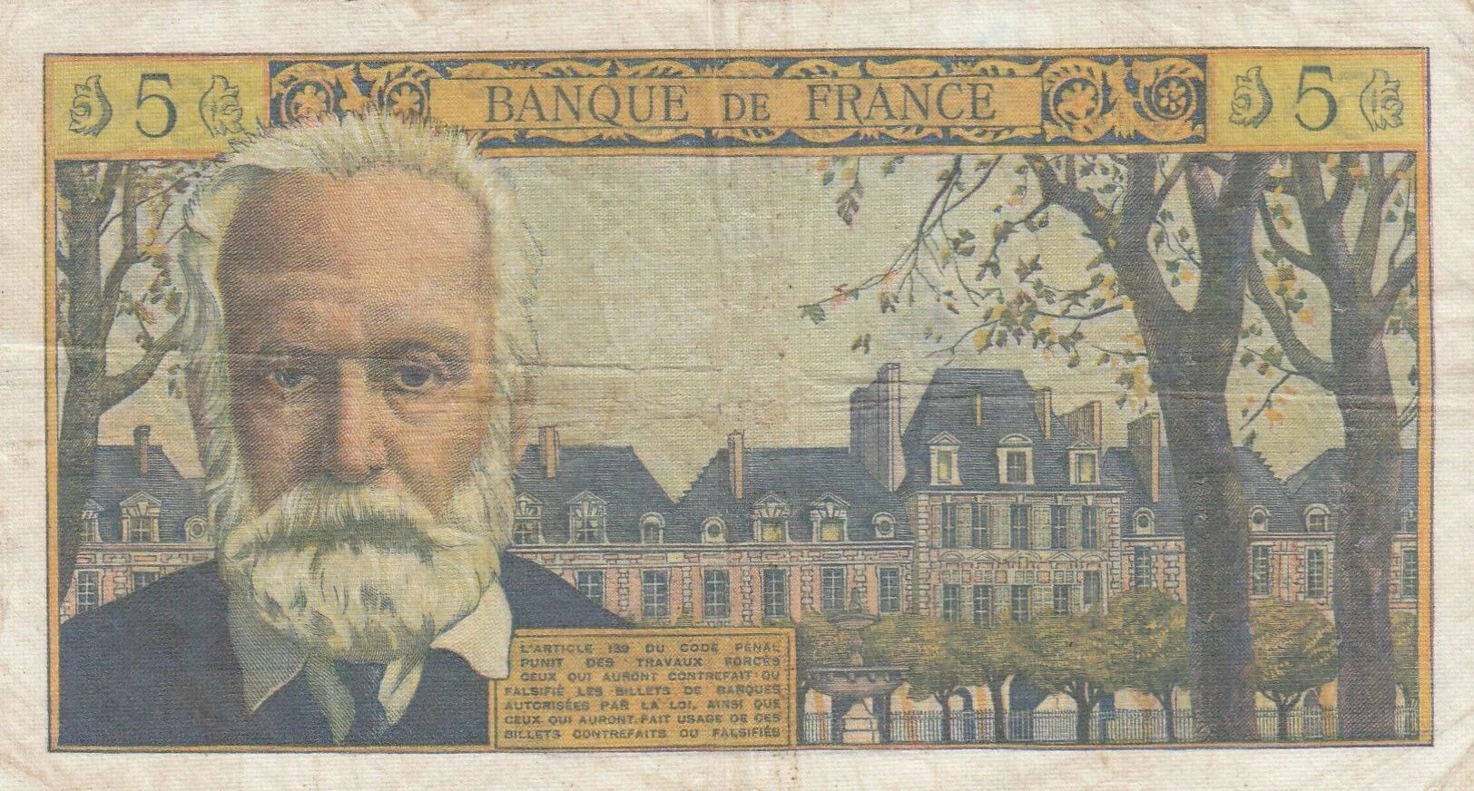 This French banknote with a nominal value of five francs was issued in 1963. It belongs to Series B.101.