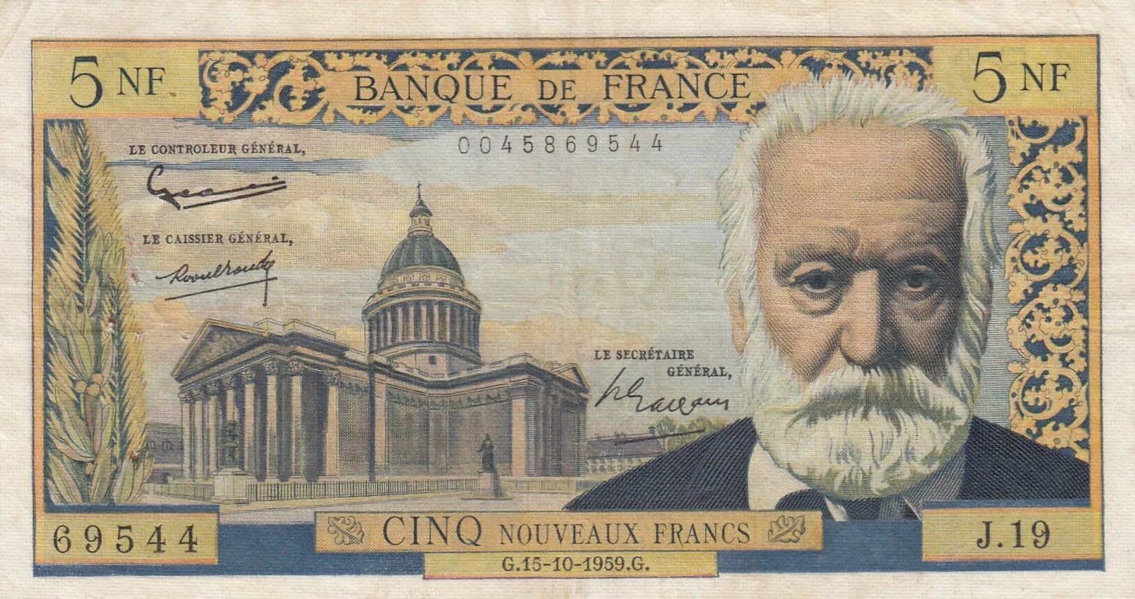 The front of the banknote features a portrait of Victor Hugo on the right side. In the background, a representation of the Panthéon is visible. The Panthéon is an emblematic monument of Paris, originally built as a church, it has become a republican temple housing the tombs of prominent figures in French history, including Victor Hugo himself.
