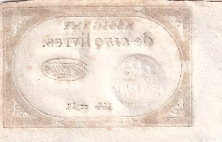 A dry stamp is affixed to the lower left of the assignat. This stamp, with a diameter of 26 mm, represents the Genius of the Constitution seated. He leans on the statue of Artemis (symbol of Nature) on the right and on the Tables of the Law on the left, where one can read "DROIT DE L'HOM" (Right of Man). This dry stamp was engraved by GATTEAUX.