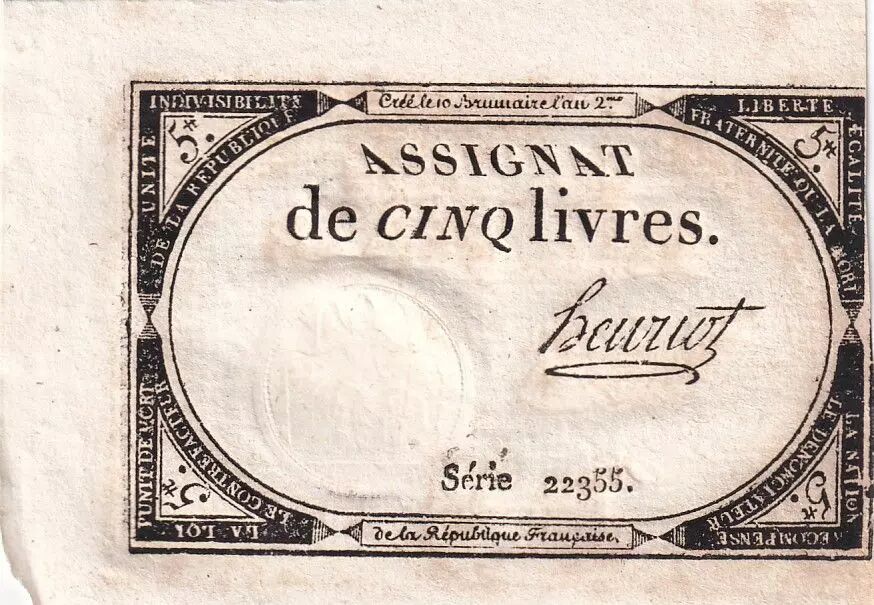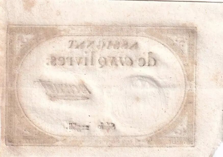 The reverse of the assignat is blank. A watermark is present, displaying the value "5" and the monogram "RF" (République Française) in a circle.