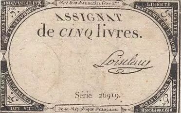 Banknote France 5 Pounds - 10 Brumaire Year II (31.10.1793) - Sign. Loiseleau - Serial 26919