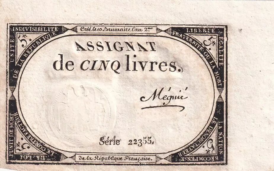 This is a five-livre assignat issued in France, dated 10 Brumaire An II (October 31, 1793) according to the Republican calendar. The signature affixed is that of Mégnié. This assignat is part of a total issue of 28744 different series, with about a hundred different signatories.