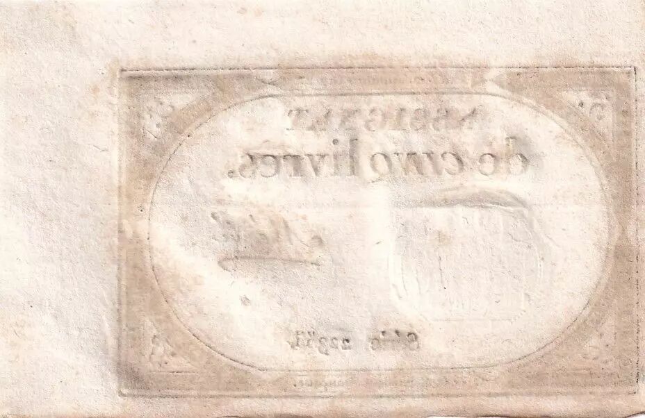 A dry stamp is affixed to the bottom left of the assignat. This stamp, with a diameter of 26 mm, represents the Genius of the Constitution seated. It leans on the statue of Artemis (symbol of Nature) to his right and on the Tables of the Law to his left, where one can read "DROIT DE L'HOM". The dry stamp was engraved by GATTEAUX.