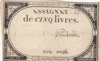 Banknote France 5 Pounds - 10 Brumaire Year II (31.10.1793) - Sign. Poidevin - Serial 10038