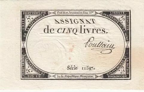 Banknote France 5 Pounds - 10 Brumaire Year II (31.10.1793) - Sign. Poullain - Serial 11547