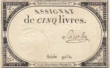 Banknote France 5 Pounds - 10 Brumaire Year II (31.10.1793) - Sign. Sanche - Serial 9252