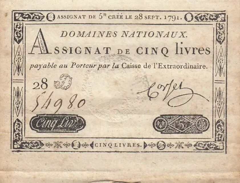 Banknote France 5 Pounds - 28-09-1791 - Sign. Corsel - Serial 28D