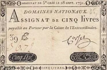 Banknote France 5 Pounds - 28-09-1791 - Sign. Corsel - Serial 39E