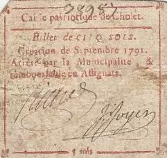 Billet France 5 sols - Maine et loire - Caisse patriotique de Cholet - Septembre 1791