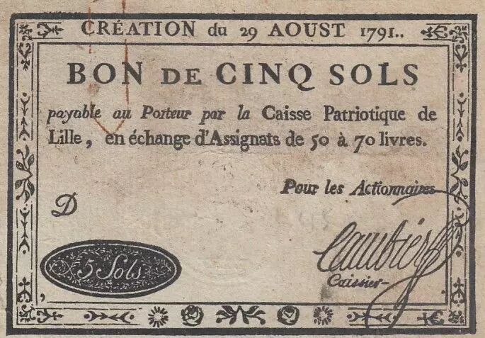 Banknote France 5 sols - Nord - Patriotic fund of Lille - 1791