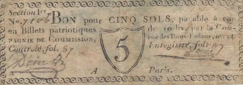 Banknote France 5 sols - Seine - Paris - Compagnie de Commission - 1792