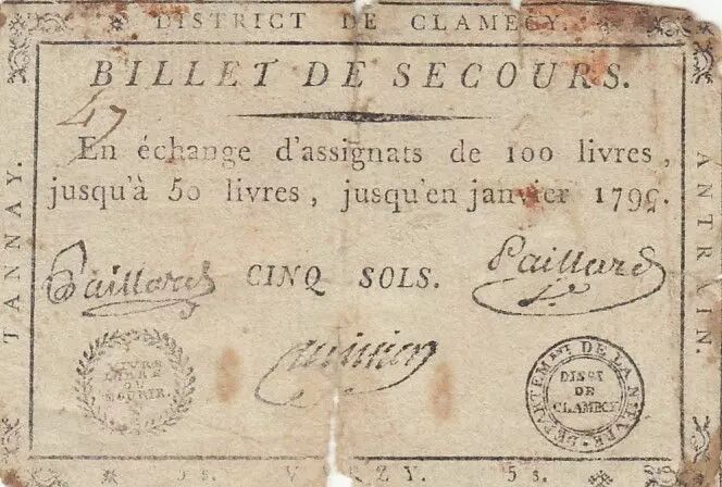 Banknote France 5 sols - Tannay - Antouin - Varzy - Clamecy's district - 1792