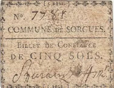 Banknote France 5 sols - Vaucluse - Sorgues - 1792