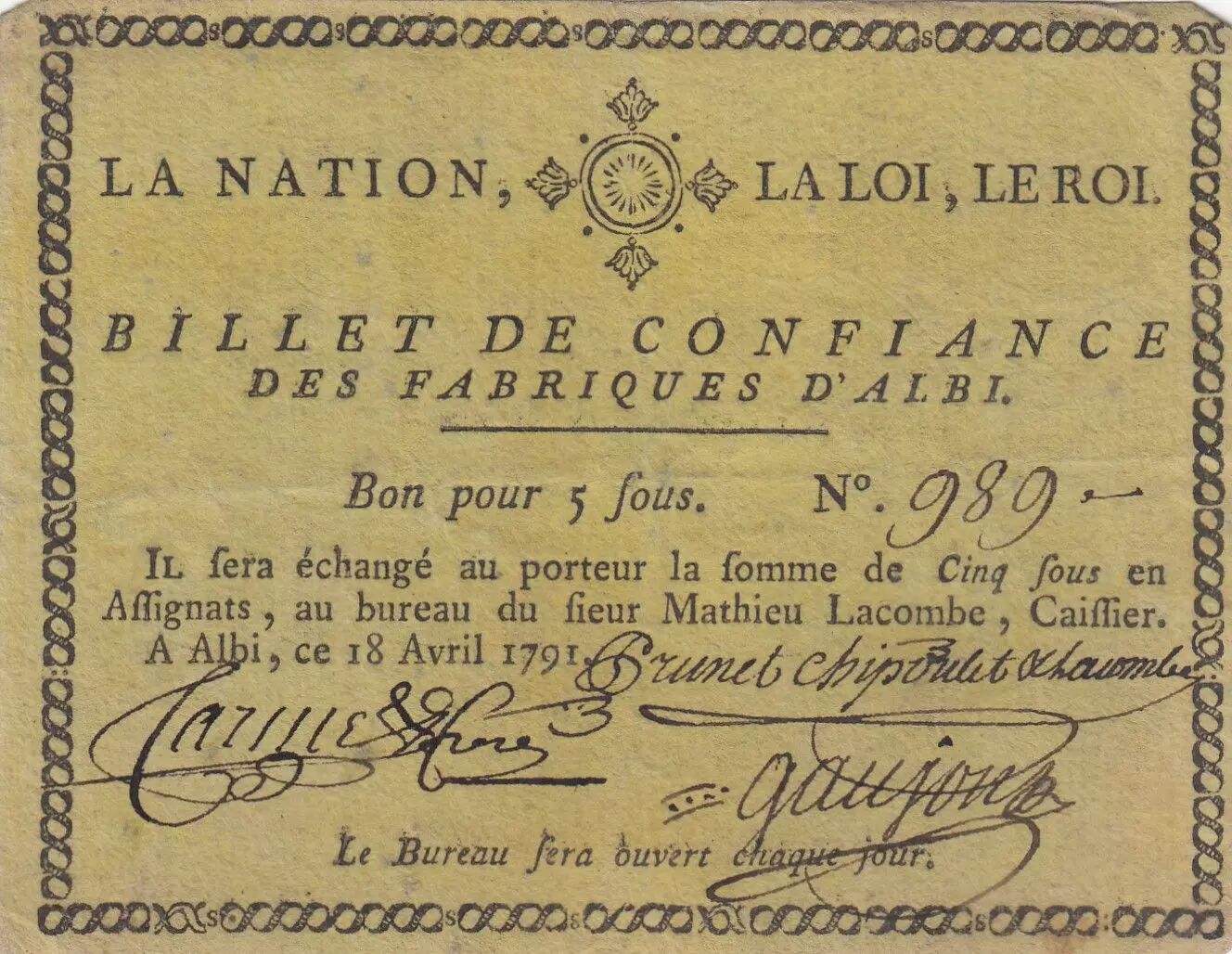 Home > > France 5 Sous - Billet de confiance - 1791 - Fabriques d'Albi - French Revolution - n°989