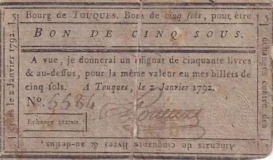 Banknote France 5 Sous - Calvados - Bourg de Touques - 02-01-1792