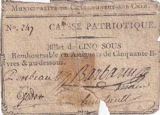 Banknote France 5 Sous - Cher - Chateauneuf-sur-Cher - Caisse Patriotique - 1792