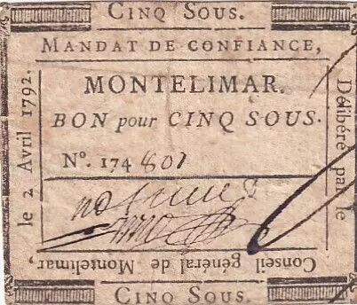 Banknote France 5 Sous - Drôme - Commune de Montelimar - 02-04-1792