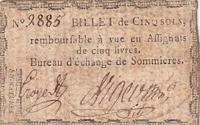 Billet France 5 Sous - Gard - Bureau d'échange de Sommières - 1791