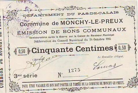 Banknote France 50 cent. Monchy-Le-Preux
